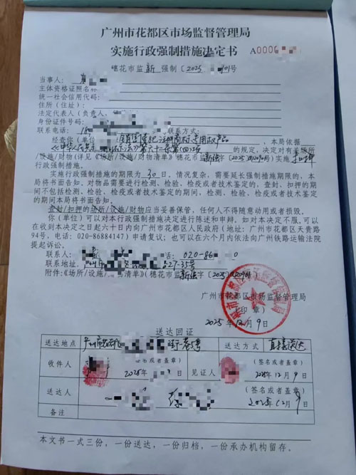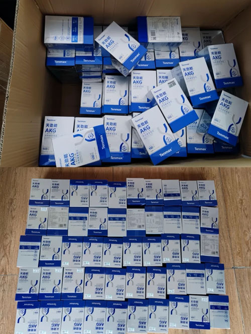 面对假货泛滥的困扰,天美仕公司高度重视并迅速采取行动。自今年8月以来,三个月的深入摸排与追踪。最终锁定互联网平台“贝瑜xxx进口专营”、“夏远xxx保健进口专营店”和“逸x康店铺”存在售假嫌疑,经过周密的部署与调查取证,最终锁定售假窝点位于“广州市花都区大陵区xxxx一巷5号”。2025年12月9日,天美仕联合所属区域执法机关,雷霆出击,当场对于“天劲能AKG”假冒产品进行查抄收缴,成功取缔售假窝点。