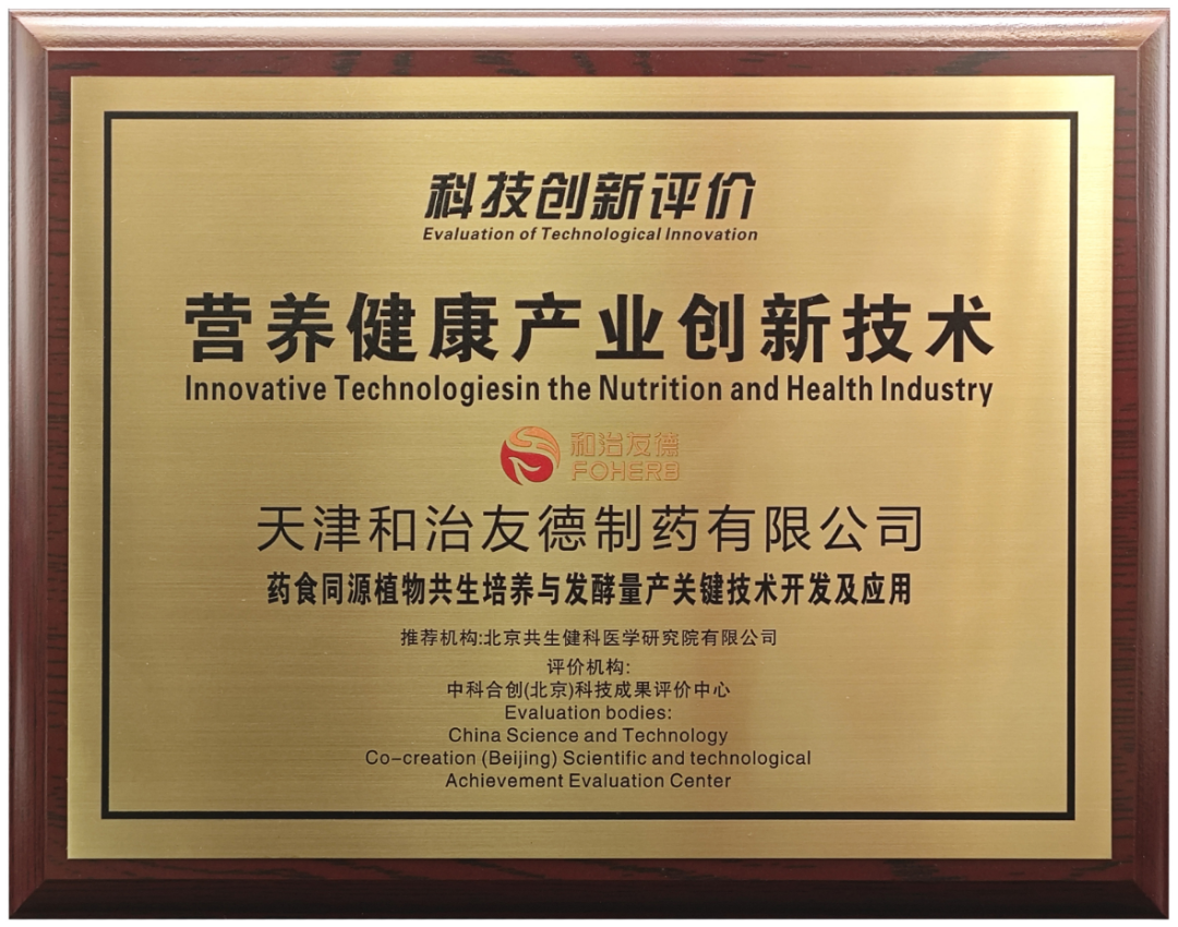 近日,天津和治友德制药有限公司《药食同源植物共生培养与发酵量产关键技术开发及应用》项目,成功通过营养健康产业创新技术科技创新评价,获取了中国保健协会、中科合创(北京)科技成果评价中心颁发的《营养健康产业创新技术》奖牌、证书和评价报告,和治友德科技创新能力再次获得权威认可。