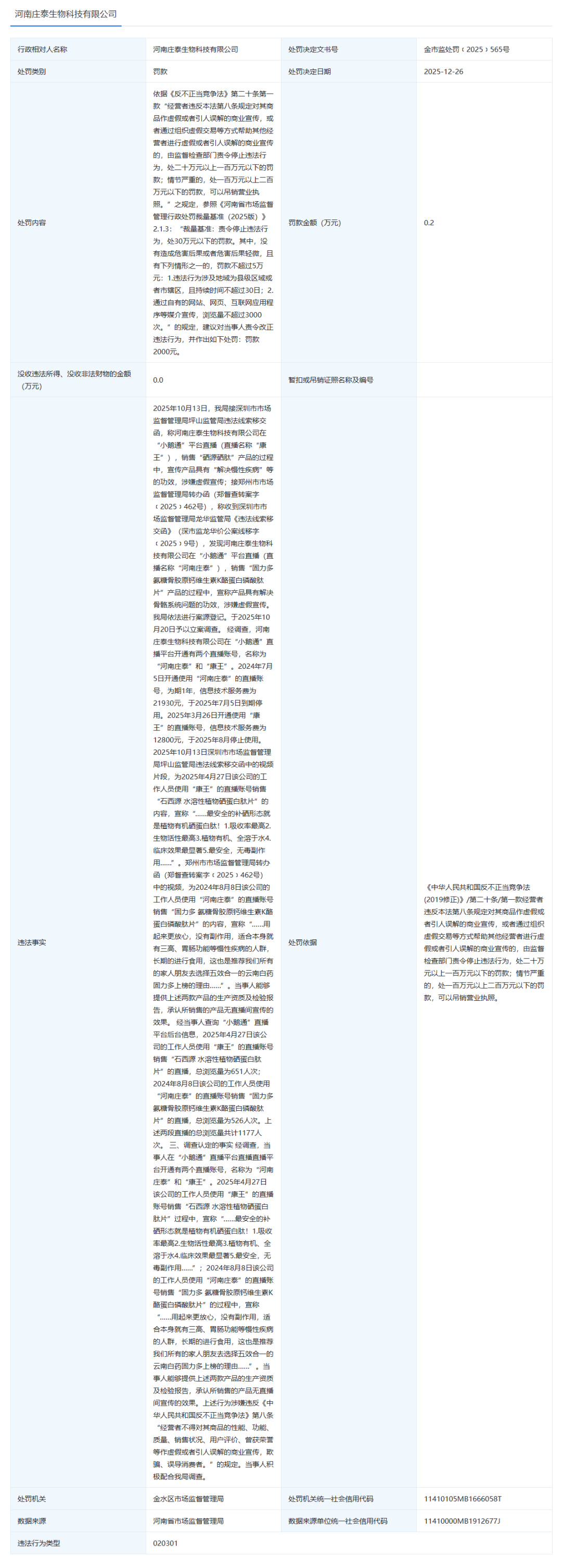 2025年12月26日,郑州市金水区市场监督管理局发布行政处罚决定书(金市监处罚〔2025〕565号),河南庄泰生物科技有限公司因在直播中对其销售的产品进行虚假宣传,被处以罚款2000元的行政处罚。