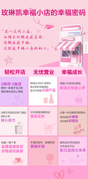 渠道革新:“幸福小店”打造专属零售闭环。2021年,玫琳凯正式推出“幸福小店”线上零售平台,开创了美妆行业“个人专属店+公司强背书”的创新模式。美容顾问仅需158元低门槛即可开通个人专属店铺,无需囤货、不承担发货压力,由公司统一负责物流配送与售后服务,真正实现“零库存轻运营”。这一广受喜爱的创业平台荣膺2021麒麟国际广告奖。