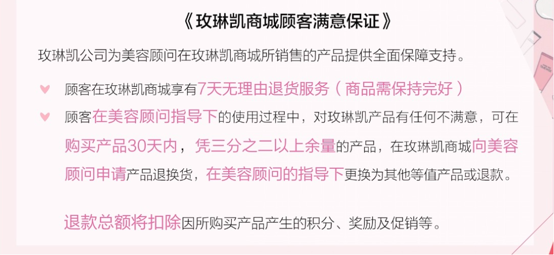 信任筑牢:全周期保障体系护航消费安全。为破解美妆行业售后争议、假货泛滥等消费痛点,玫琳凯建立了远超行业标准的消费保障体系。在“7天无理由退换”基础上,推出“30天顾客满意保证”,消费者若对产品功效不满意,可凭剩余余量申请退换,有效打消试用顾虑。