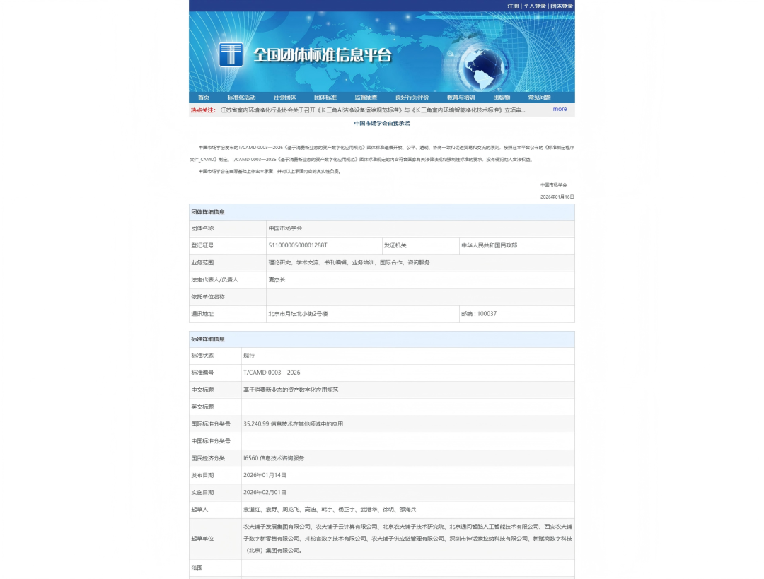 近日,由农夫铺子发展集团有限公司牵头,联合产业链内多家单位共同编制的《基于消费新业态的资产数字化应用规范》(T/CAMD 0003—2026)团体标准,经中国市场学会正式发布,并于2026年2月1日起实施。该标准是国内首个针对消费新业态场景下资产数字化应用的规范性文件,标志着农夫铺子在数字经济与实体消费融合领域,再次实现从技术实践到行业标准引领的重要跨越。