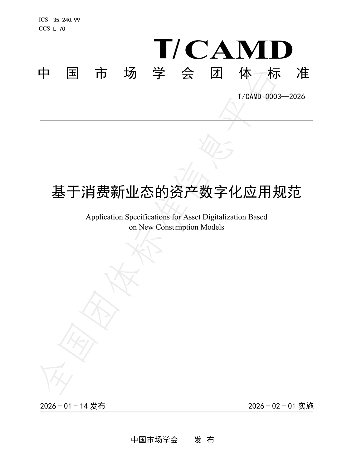 【图二:《基于消费新业态的资产数字化应用规范》(T/CAMD 0003—2026)团体标准封面】