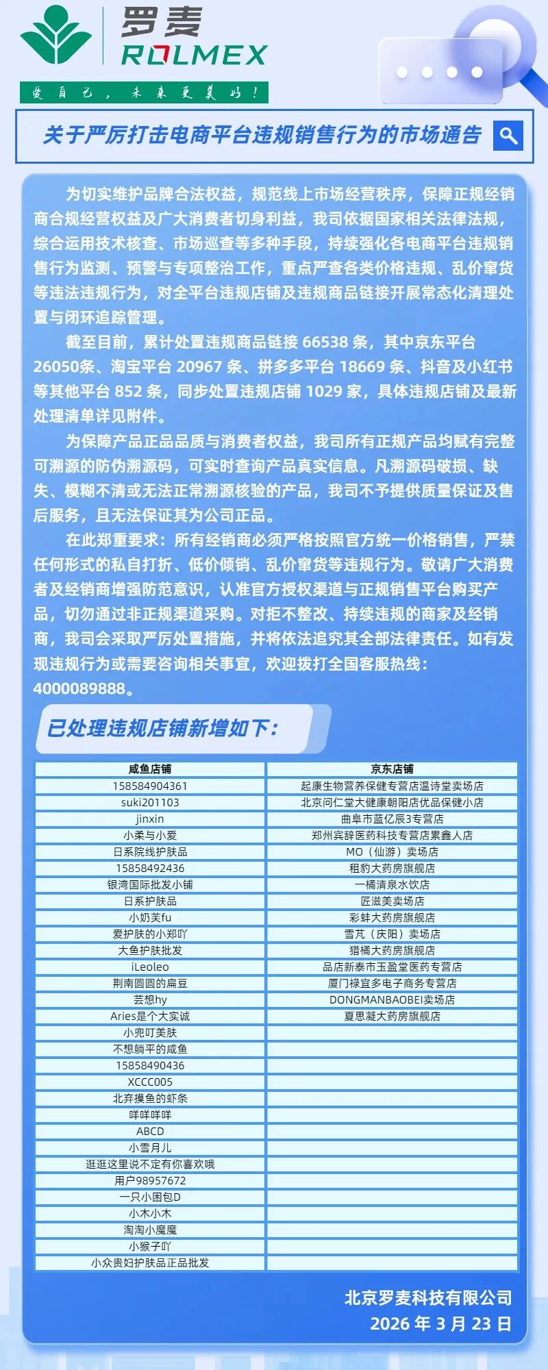 罗麦发布市场通告 严厉打击电商平台违规销售行为