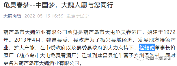 值得注意的是,在该公众号发布的资料当中,董事长的名字有时写作程耀德,有时写作程晓志,这种说法无疑存在矛盾之处,根据相关公开报道显示,程晓志才是大魏酒业董事长真正的名字。