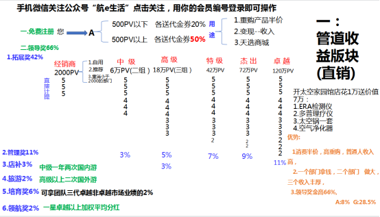 为什么还有很多经销商对东方红的事业十分着迷呢?经销商李先生告诉颜值君,东方红的奖金制度很好,“综合了直销、新零售、微商”的所有优点。李先生称,东方红航天生物的加盟方式很简单,首先要用自己的身份证,在APP“航e生活”上进行实名注册,成为会员之后消费可以获得现金和优惠券,这个现金就是推荐新人注册购买产品获得的推荐奖。会员自己重复消费也可以获得现金和优惠券。