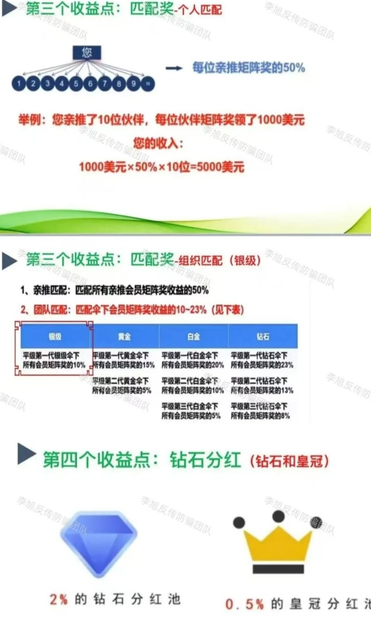 (4)分红机制:钻石会员享营业额2%分红,皇冠会员额外获得全球0.5%平均分红