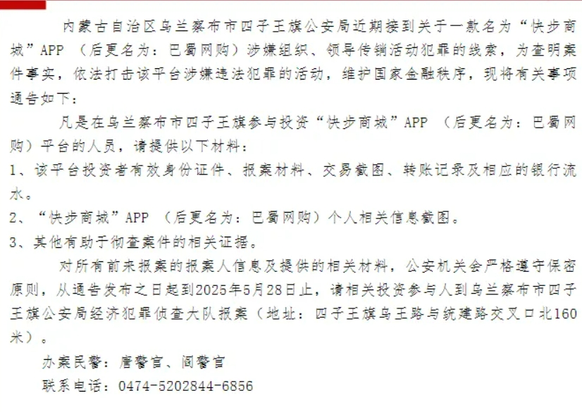 “凡是在乌兰察布市四子王旗参与投资‘快步商城’APP (后更名为:巴蜀网购)平台的人员,请提供以下材料。”