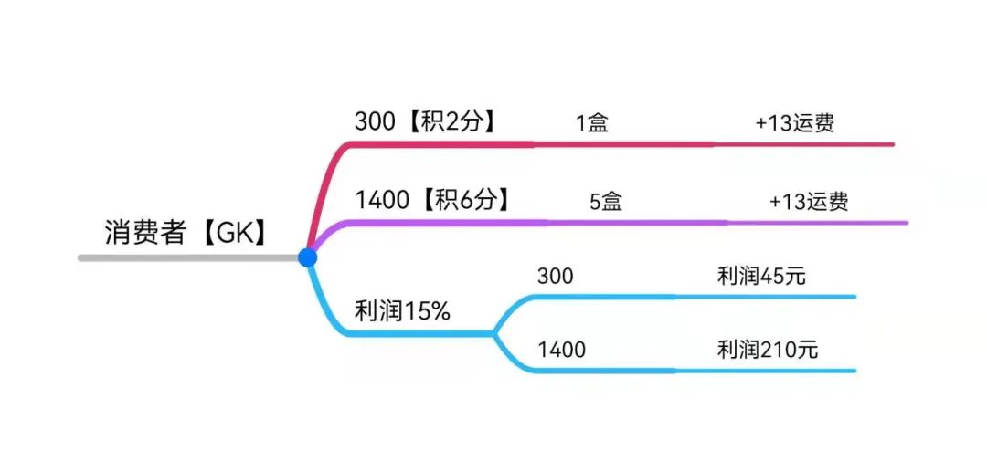 其次,原来的光明新零售是六级代理,而现在的唯奕贝是三级。代理门槛也有原来的43元提高到313元。唯奕贝将代理商分为GK(黄金)、DK(钻石)、SSK(王者),一盒产品售价300元,五盒(一组)产品售价1400元,运费可能是13元,也可能是15元或18元,在国内大部分地区都按13元计算。
