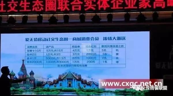 3月中旬,在长沙某酒店举行的“爱无价移动社交生态圈联合实体企业家高峰论坛”活动上,爱无价商城的讲师不断吹嘘其“消费赚钱”模式,而最主要的则是推广其商城会员政策。按照该公司政策,该公司会员分为银卡、金卡、钻石卡和至尊卡四个级别,每个级别都需要消费不同金额才可加入,消费的会员可以获得所谓的“产品”、现金券和红包。假如消费2万元成为钻石卡,除了获得3万元产品外,还有3万元现金券和2000元现金红包,最主要的是获得了拉人做业绩的权力。