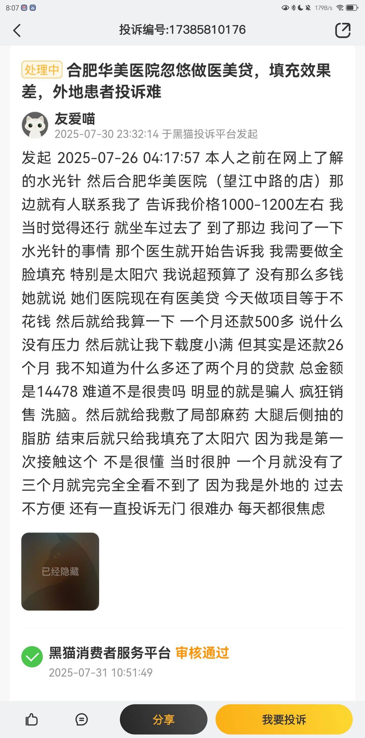 截至深度美业发稿前,上述消费者阐述的消费经历均为各消费者单方陈述,黑猫投诉显示,上述案例均在处理中,合肥华美医疗美容机构尚未进行书面解释,而消费者所诉问题亦尚未有医疗鉴定或监管结论。
