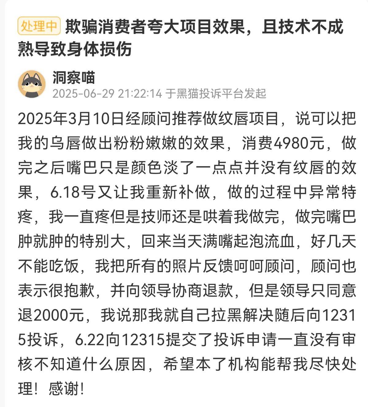 6月29日,一消费者投诉称其3月10日经顾问推荐做纹唇项目,顾问称可把该消费者的乌唇做出粉粉嫩嫩的效果,该项目消费4980元,做完后该消费者嘴巴只是颜色淡了一点点,并未呈现顾问承诺效果。6月18日,顾问又让该消费者重新做纹唇项目,做纹唇过程中该消费者感觉异常疼痛,医生哄着该消费者做完纹唇,后该消费者发现嘴巴肿得特别大,回来当天满嘴起泡流血,好几天无法吃饭。该消费者将所有照片反馈给顾问,顾问表示抱歉后向该机构领导协商退款事宜,领导只同意退还2000元。