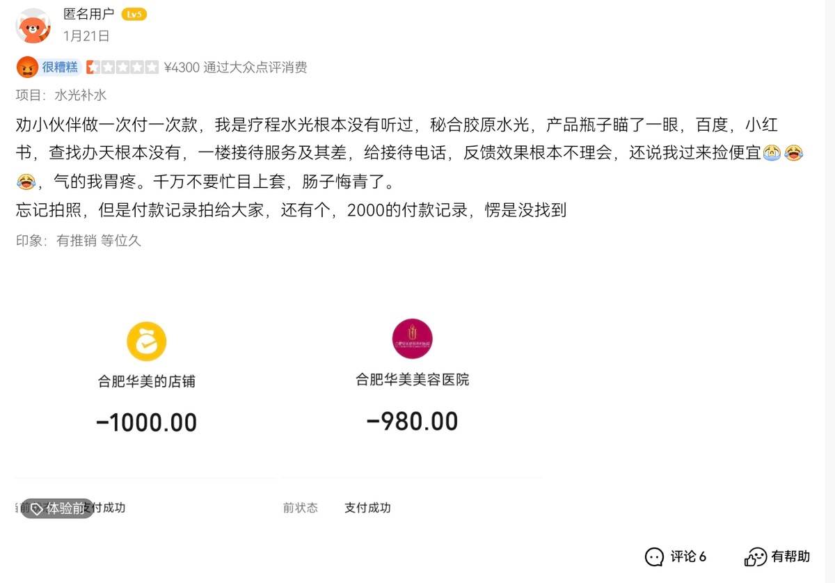 1月21日,同样有消费者评价劝其他消费者做一次付一次款。该消费者表示自己完全没有听过秘合胶原水光,看了一下产品瓶子后,在百度、小红书查找许久都没有相关信息。且该机构一楼接待服务极其差,该消费者给接待打电话反馈效果时对方根本不理会,还称该消费者是捡便宜的。这令该消费者十分生气,提醒其他消费者千万不要盲目上套。