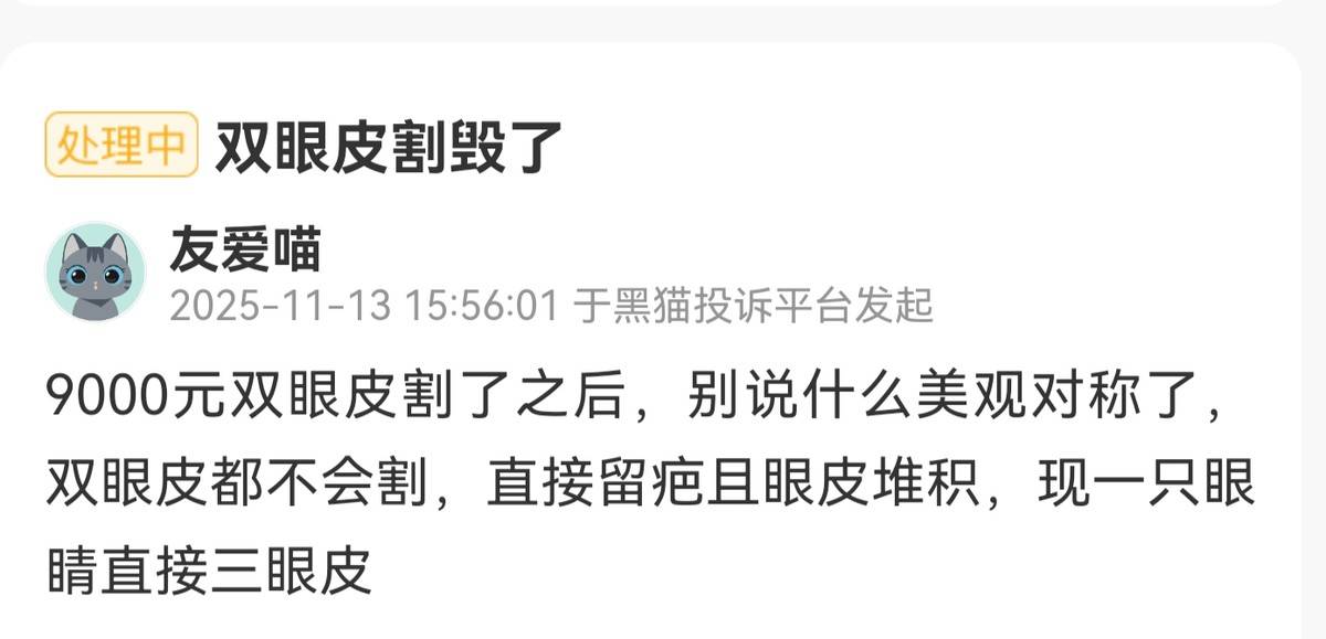 11月13日,有消费者在黑猫投诉平台反映,在花费9000元做双眼皮手术后,别说美观对称,连双眼皮都没割好,不仅留疤且眼皮堆积,一只眼睛直接变成三眼皮。