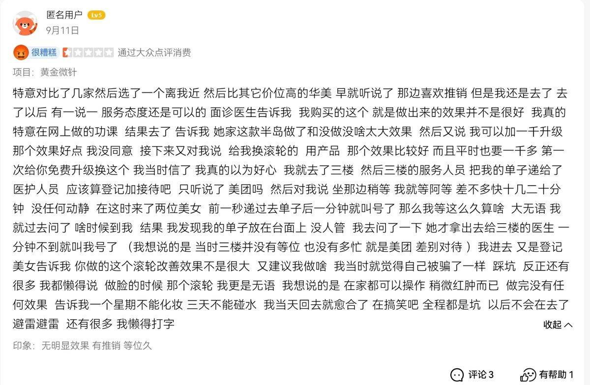 9月11日,另一该消费者给出差评称其特意对比几家后选了一家离自己近且比其他价位更高的华美,虽然早就听说了该机构喜欢推销,但还是去了。该消费者表示,该机构服务态度还行,面诊医生告知其购买的这个项目做出来效果并不好。该机构这款半岛没太大效果,接着医生又说可以加一千升级效果好点的,该消费者没同意。之后医生又说给其换其他的,称那样效果比较好,且平时做也要一千多。因该消费者第一次消费,给其免费升级。该消费者当时信了,就去到该机构三楼,三楼服务人员将其单子递给医护人员,让其坐那边稍等,该消费者等了差不多快十几二十分钟没任何动静。这时来了两位顾客的,前一秒递过去单子后一分钟就被叫号了。该消费者等这么久觉得不合理,就过去问啥时候到自己,结果发现自己单子放在台面上没人管。去问了一下,对方才拿出去给三楼医生,一分钟不到就叫到其号了(该消费者想说当时三楼并没有等位、也没有多忙,就是差别对待)