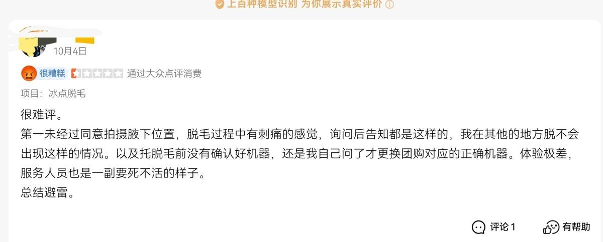 除了线上平台的集中投诉,线下服务同样问题重重。10月4日,一位消费者在大众点评发布评价。该消费者提到,该机构未经过同意拍摄腋下位置,脱毛过程中有刺痛的感觉,询问后被告知其他人都是这样。该消费者表示在其他的地方脱不会出现这样的情况。脱毛前该机构也没有确认好机器,还是该消费者自己问了后才更换团购对应的正确机器,工作人员也是态度冷漠。