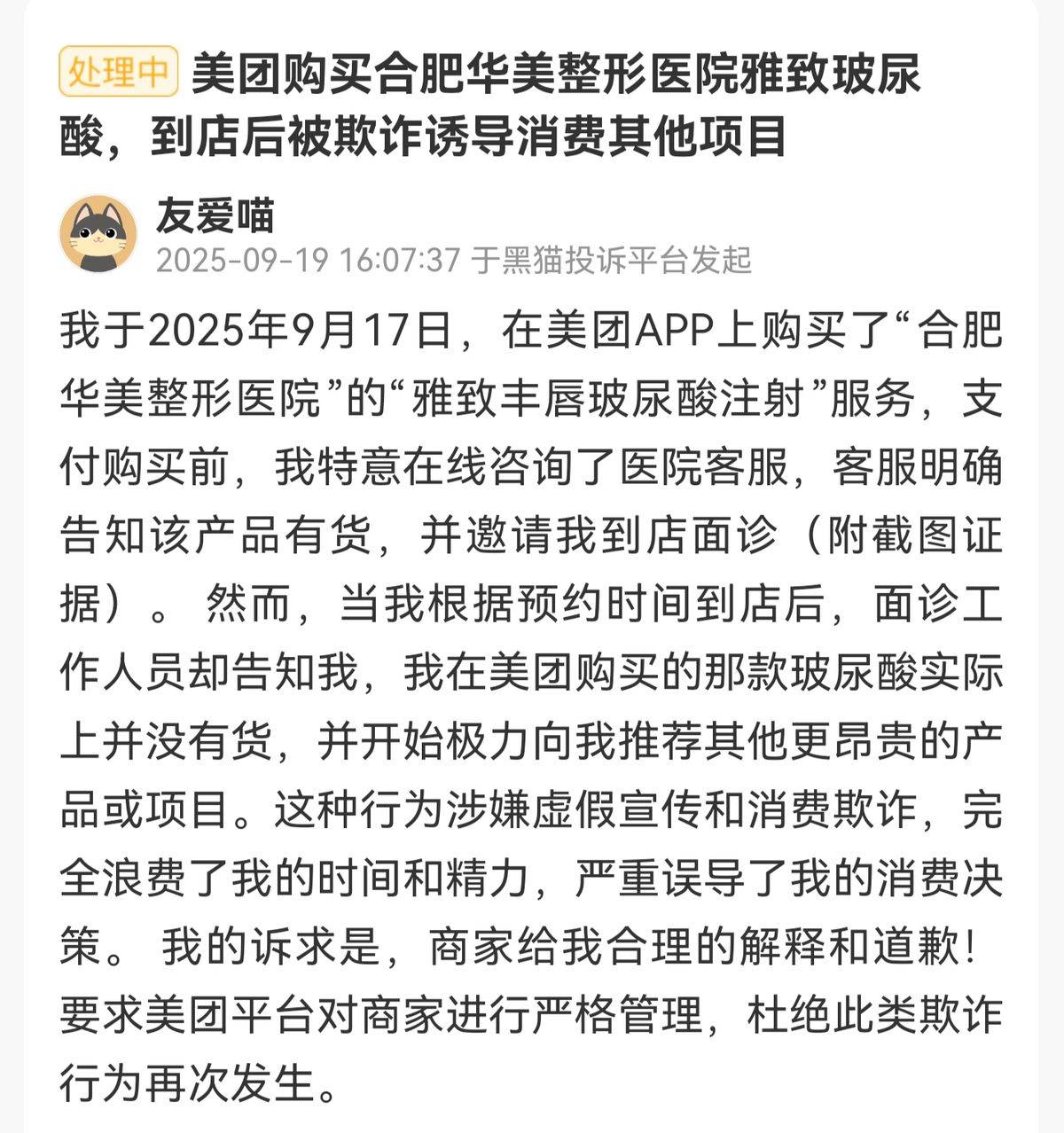 9月19日,另一消费者则描述到,其于9月17日在美团APP上购买了该机构提供的“雅致丰唇玻尿酸注射”服务,支付购买前,该消费者特意在线咨询医院客服,客服明确告知该产品有货,并邀请该消费者到店面诊。该消费者根据预约时间到店后,面诊的工作人员告知该消费者,其在美团购买的雅致丰唇玻尿酸注射实际上没有货,且极力向该消费者推荐其他更昂贵的产品或项目。