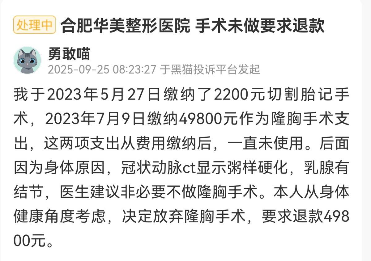 无独有偶,9月25日的一则投诉称,其于2023年5月27日缴纳了2200元切割胎记手术费用,2023年7月9日缴纳49800元作为隆胸手术支出,两项费用缴纳后一直未使用。后续因身体原因,冠状动脉CT显示粥样硬化,乳腺存在结节,医生建议非必要不进行隆胸手术。该消费者从身体健康角度考量,决定放弃隆胸手术,要求退还49800元。