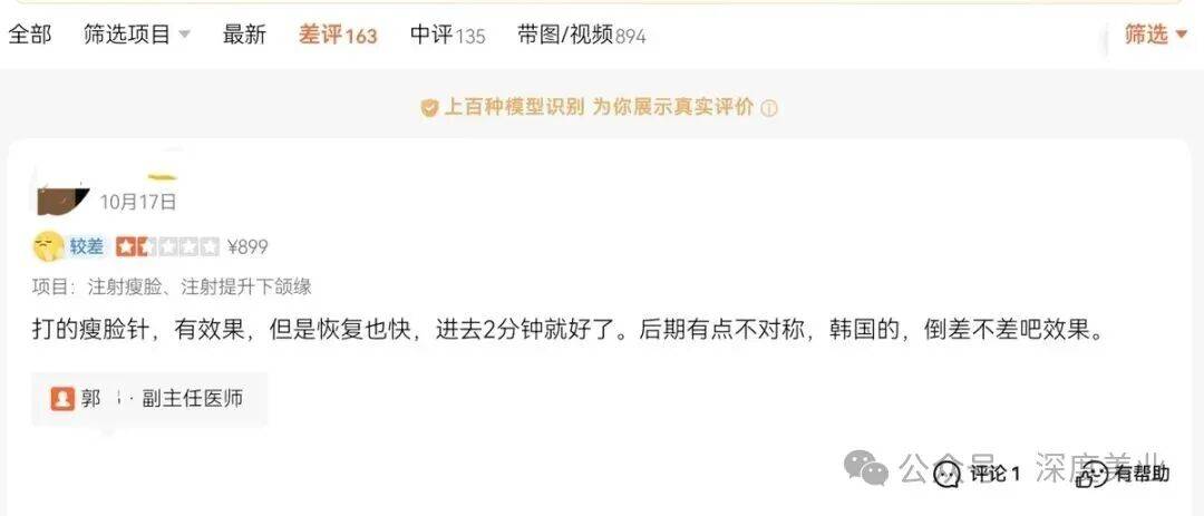 10月17日,有消费者发布评价,表示打了瘦脸针,有效果,不过恢复也快。两分钟就完成操作了,后期出现脸部不对称情况。