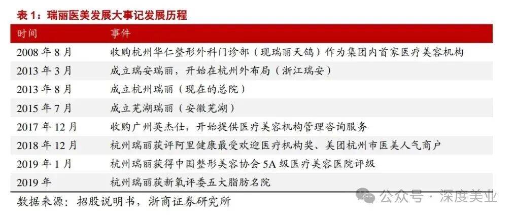 根据网络相关信息了解到,瑞丽医美的历史可追溯至2008年,由付某某(“创始人”)通过收购杭州华仁整形外科门诊部有限公司作为首家医疗美容机构发展而来。2013-2015年先后开出瑞安瑞丽、杭州总院、芜湖瑞丽,形成跨省3家机构,2016年获中整协“特别荣誉奖”,2018年在开曼设控股公司并获阿里健康“最受欢迎医疗机构奖”,2019年杭州院获评全国首批5A级医美医院。2020年12月28日登陆港交所主板。瑞丽医美的主营业务包括美容外科服务、对面部及身体多个部位进行的美容外科诊疗、微创美容服务、美容注射诊疗及皮肤美容服务等各种美容能量型诊疗。