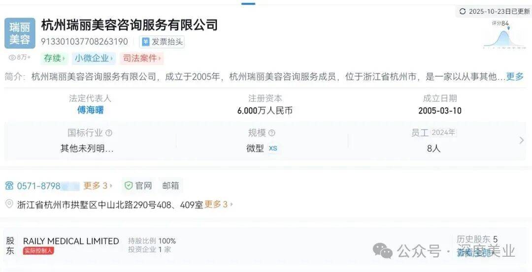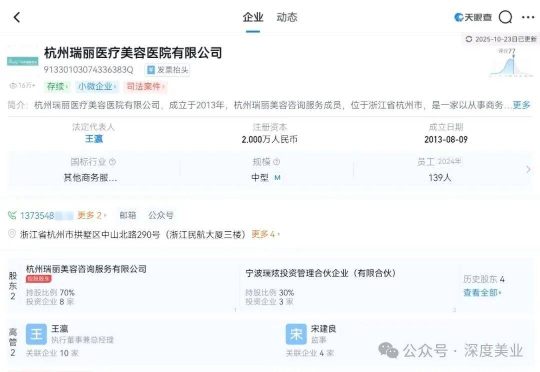 据天眼查显示,杭州瑞丽成立于2013年,由杭州瑞丽美容咨询服务有限公司及宁波瑞炫投资管理合伙企业持股,法人代表为王某。