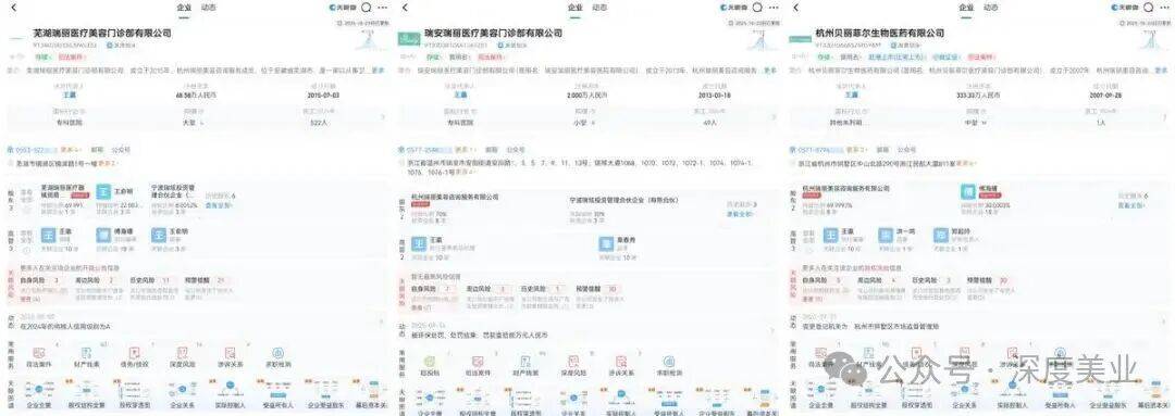 作为浙江省代表性医美连锁品牌,瑞丽医美旗下共运营有2家医疗美容医院(杭州瑞丽、瑞安瑞丽)及2家门诊部(瑞丽天鸽、芜湖瑞丽),以及杭州贝丽菲尔生物医药有限公司,法人代表均为王某。