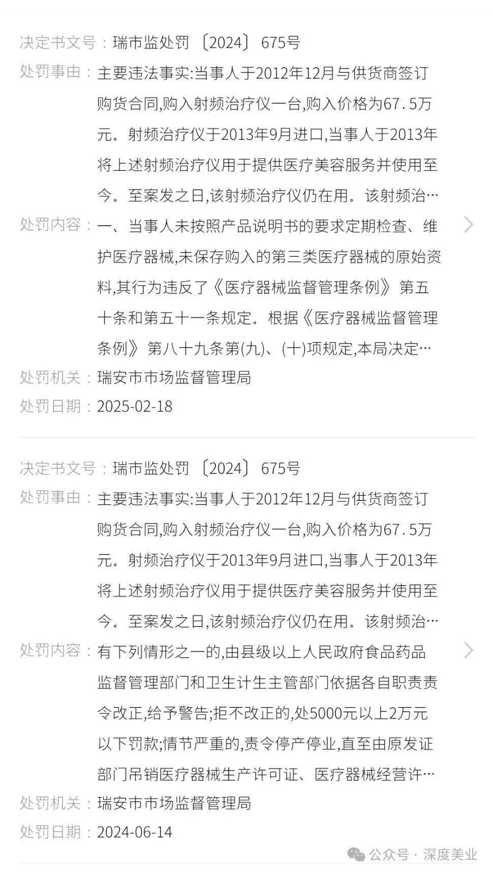 2月18日,瑞丽集团旗下的瑞安瑞丽医疗美容门诊部因2012年签约、2013年进口并投入使用的一台射频治疗仪(购入价67.5万元)未取得医疗器械注册证,另有一台半导体激光治疗仪的注册证、供应商资质未存档,也未按说明书做定期维护被瑞安市市场监督管理局处以行政处罚,罚款67.5万元。