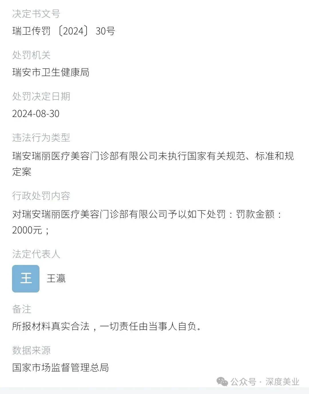 2024年8月30日,瑞安瑞丽医疗美容门诊部因未执行国家有关规范、标准和规定案,被瑞安市卫生健康局处以行政处罚,罚款2000元。