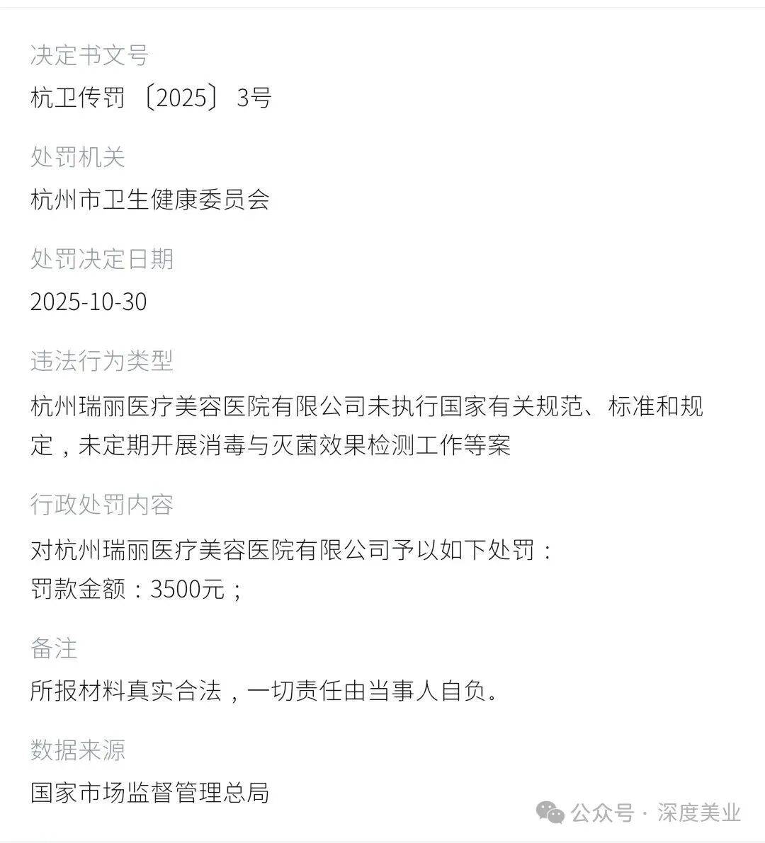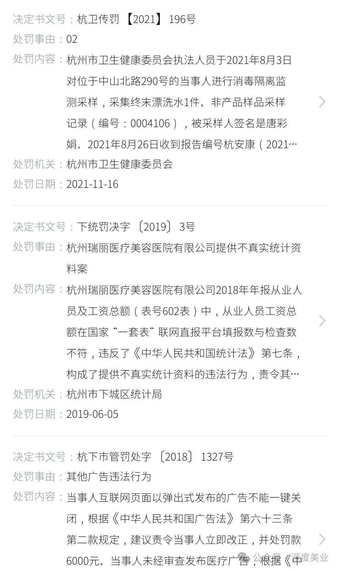 据天眼查显示,杭州瑞丽医疗美容医院除了陷入投诉及差评漩涡之中外,还曾于10月30日因未执行国家有关规范、标准和规定,未定期开展消毒与灭菌效果检测工作等被杭州市卫健委进行行政处罚,罚款3500元。