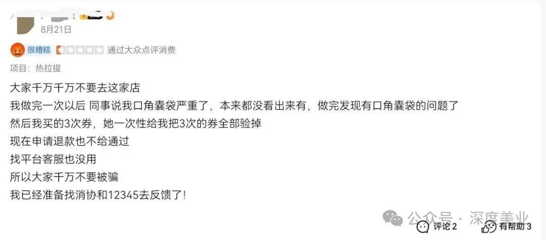 8月21日,同样有消费者给出差评提醒其他消费者不要去该机构。该消费者做完一次项目后同事说其口角囊袋严重了,本来都没看出来,做完后却发现存在口角囊袋问题。另外,该消费者表示自己明明购买的3次券,被该机构一次性将3次券全部验掉。该消费者申请退款未获通过,找平台客服也无济于事,因此该消费者提醒其他消费者千万不要被骗,该消费者已准备向消协和12345反馈。