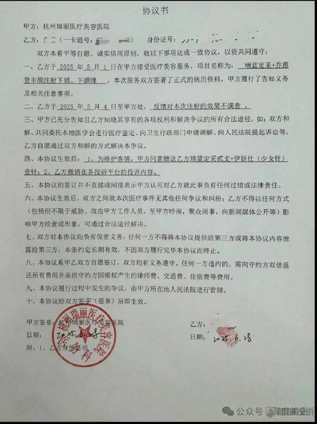 根据黑猫投诉平台信息显示,杭州瑞丽在7月7日上传了与该消费者于6月28日签订的协议书,双方达成了和解。