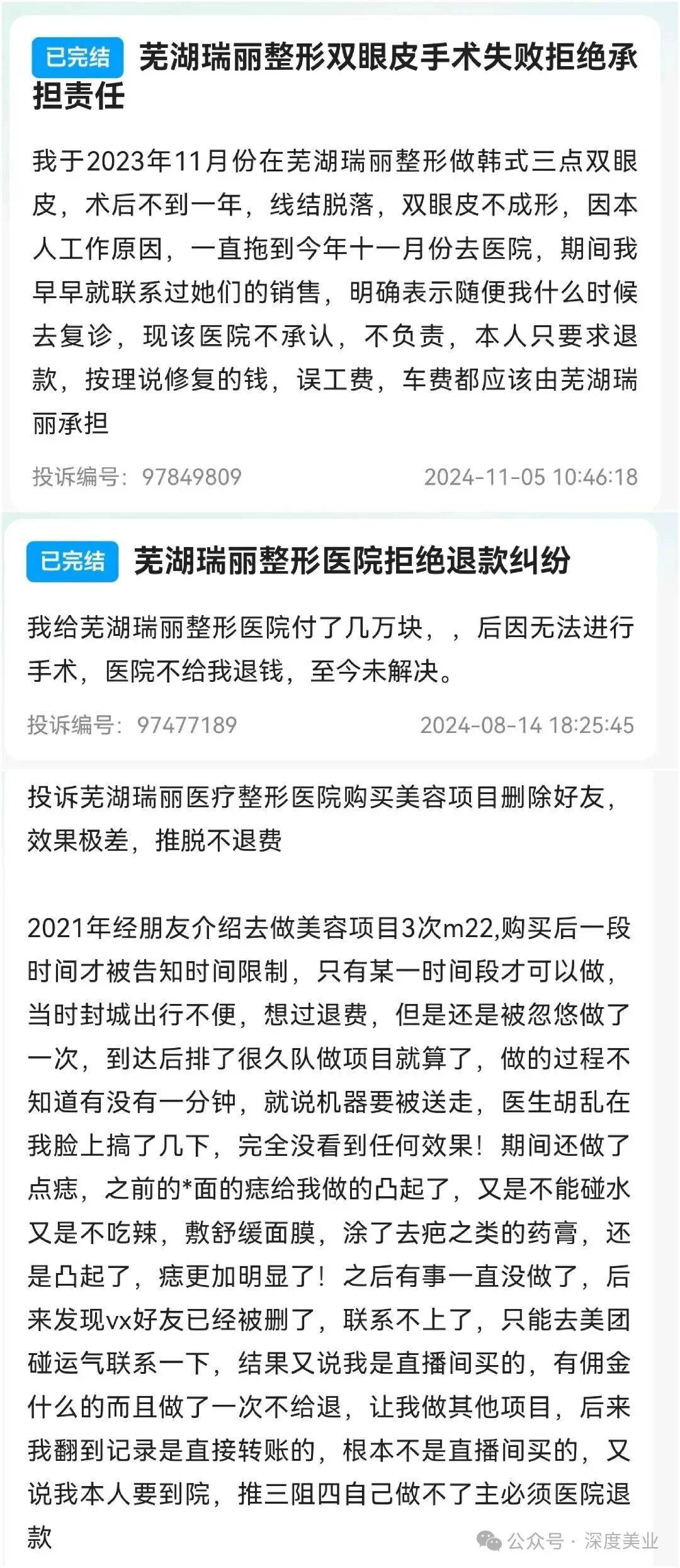 此外,消费保平台上也存在着瑞丽医美旗下其他机构的相关投诉。问题主要集中在手术效果不佳,售后拖延,退款纠纷上。