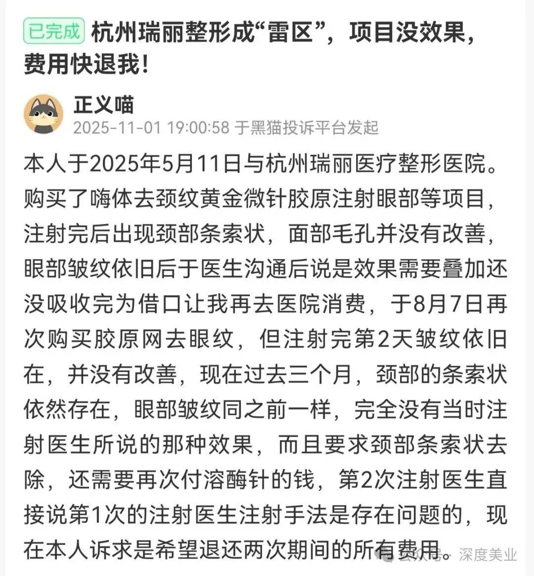 11月1日,一位消费者在黑猫投诉平台发起投诉。该消费者称其于5月11日前往杭州瑞丽医疗整形医院,购买了嗨体去颈纹、黄金微针胶原注射眼部等项目。据消费者描述,注射完成后,该消费者出现颈部条索状情况,且面部毛孔未得到改善、眼部皱纹依旧存在。后续与该机构医生沟通时,对方以效果需叠加、产品还未吸收完毕为理由,劝说该消费者再次前往医院消费。