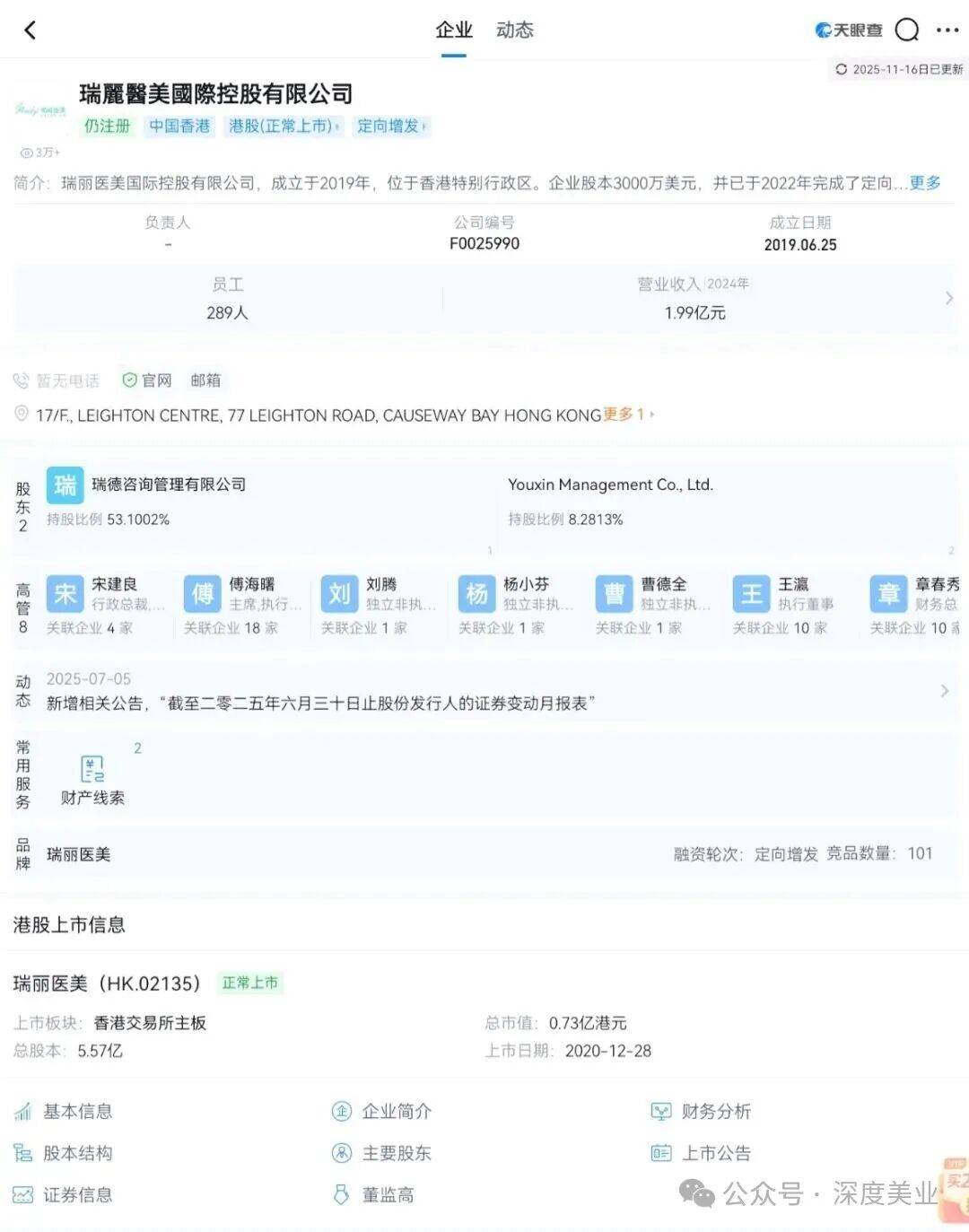 通过天眼查查询发现,杭州瑞丽美容咨询服务有限公司的实际控制人正是成立于2019年的上市公司瑞丽医美国际控股有限公司,由付某某担任主席等职务,杭州瑞丽医疗美容医院的法人代表王某在瑞丽医美国际控股有限公司中担任执行董事一职。