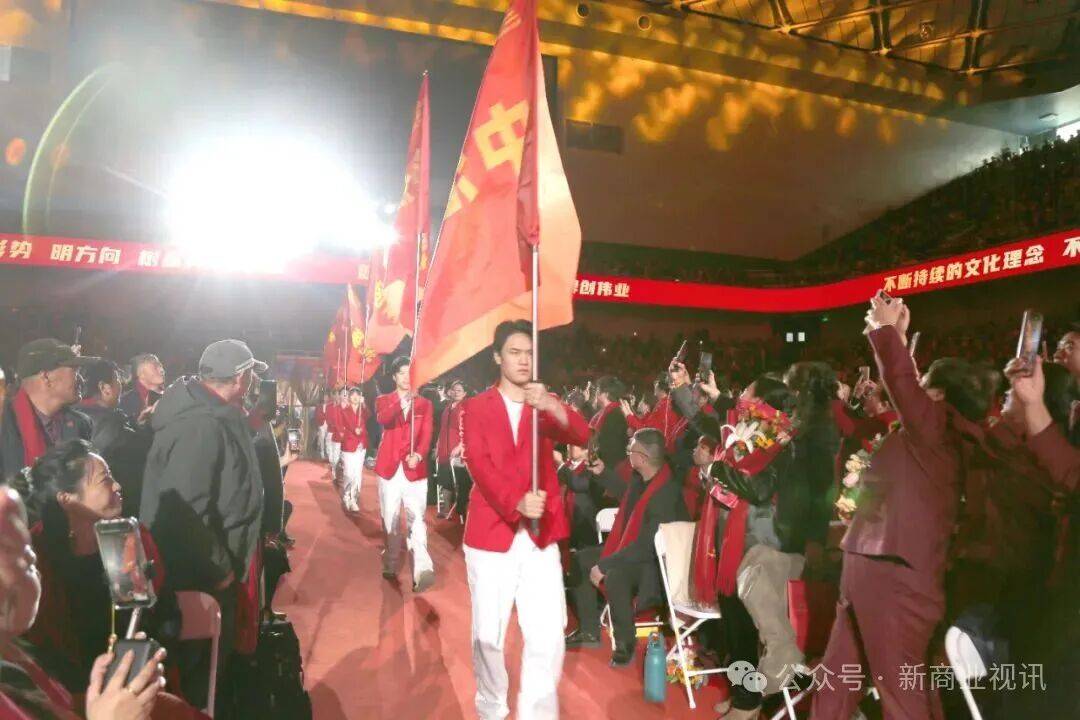 13时,会场内灯光璀璨、气氛热烈。随着六名小号手奏响昂扬的序曲,年会盛典正式拉开帷幕。在铿锵有力的战鼓声中,来自各团队的数十名旗手高擎队旗,迈着坚定步伐依次入场,呐喊声汇聚成磅礴力量,金科伟业司旗的庄严入场将现场氛围推向第一个高潮,生动诠释了金科大家庭的团结与凝聚力。