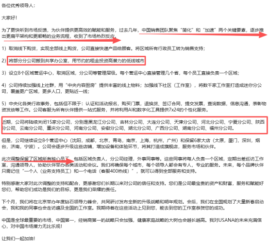 据了解,在中国区,优莎娜已经宣布了相应的方案:包括陆续关闭15家分公司、分公司搬至共享办公室、保留区域核心员工等等。