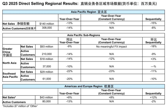 这份不满从三季度财报中可以窥见:全球直销活跃客户数量从2024年三季度的45.2万人跌至今年的38.8万人,同比流失6.4万人,环比二季度流失3万人,几近总流失的一半。