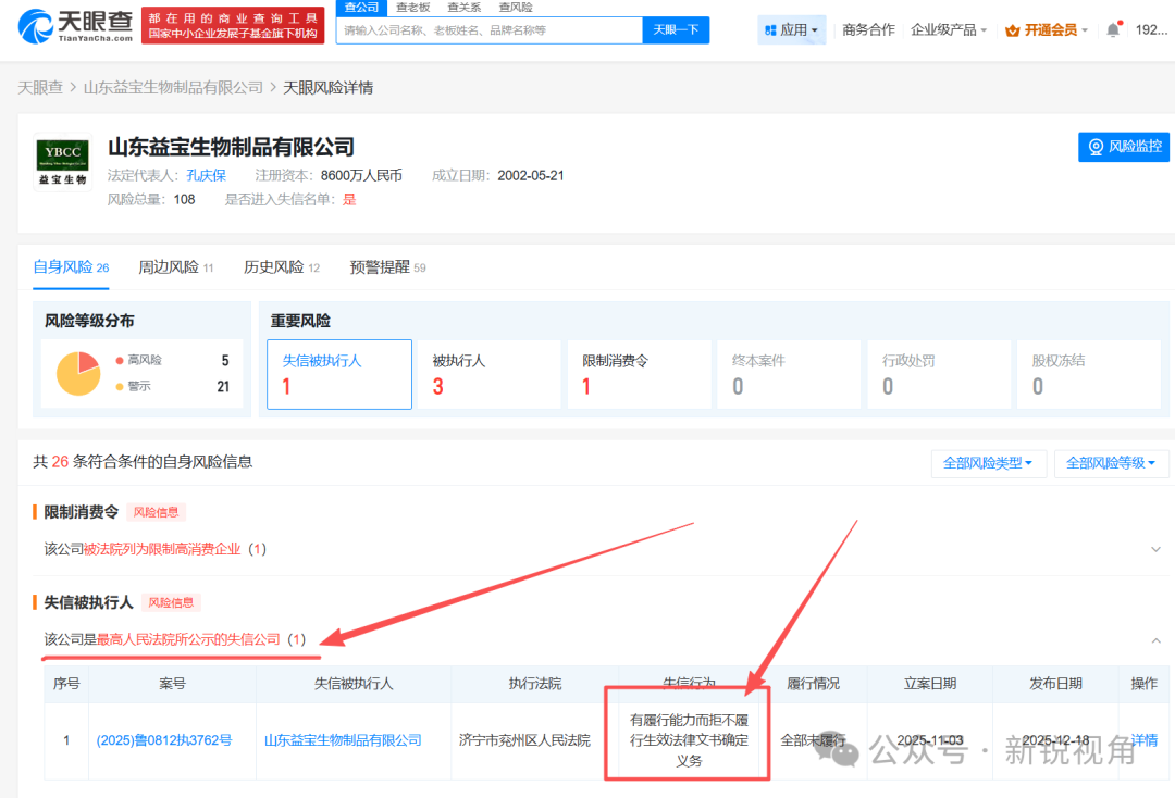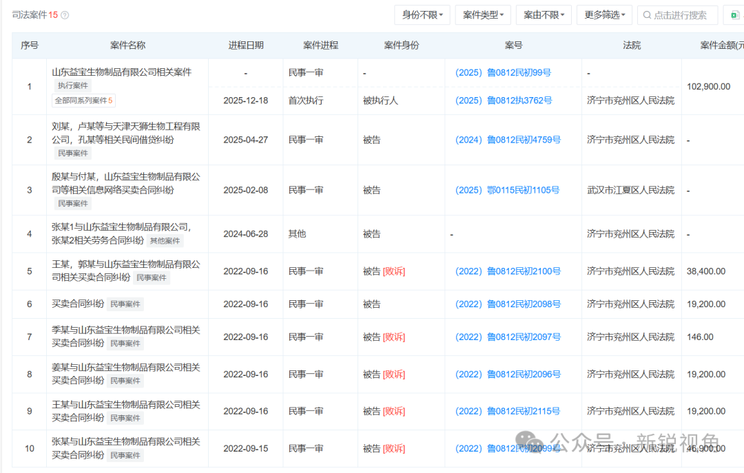 通过天眼查我们得知“山东益宝生物制品有限公司”已经被“最高法”披露为失信企业。这是什么原因呢?通过进一步了解,我们得知“山东益宝生物制品有限公司”(下文简称山东益宝)被多起民事诉讼缠身。原告均要求山东益宝退还购物款,山东益宝均败诉。并且该企业存在拖欠税款、为传销提供经营场所被市监局处罚等多种预警隐患。又因存在执行能力,拒不执行被法院认定为失信被执行人,并被限制高消费。全部司法案件金额90余万。