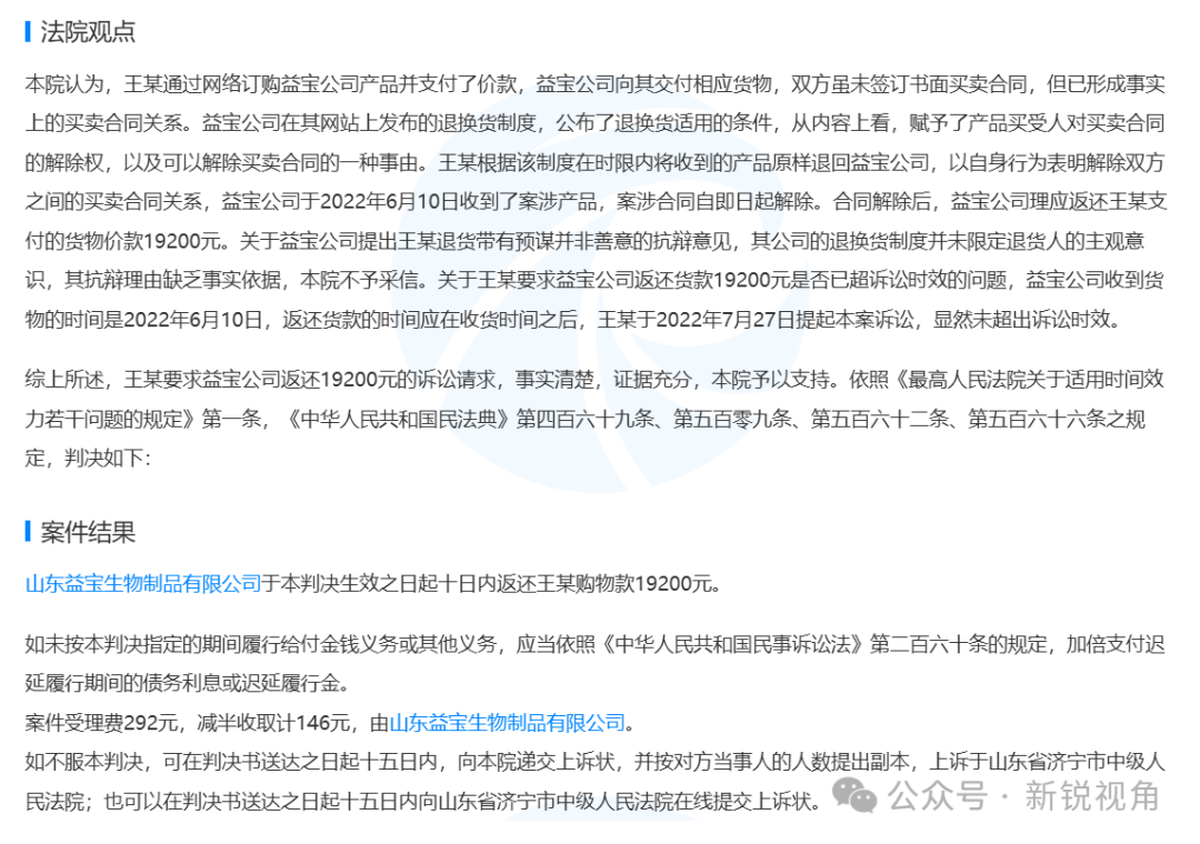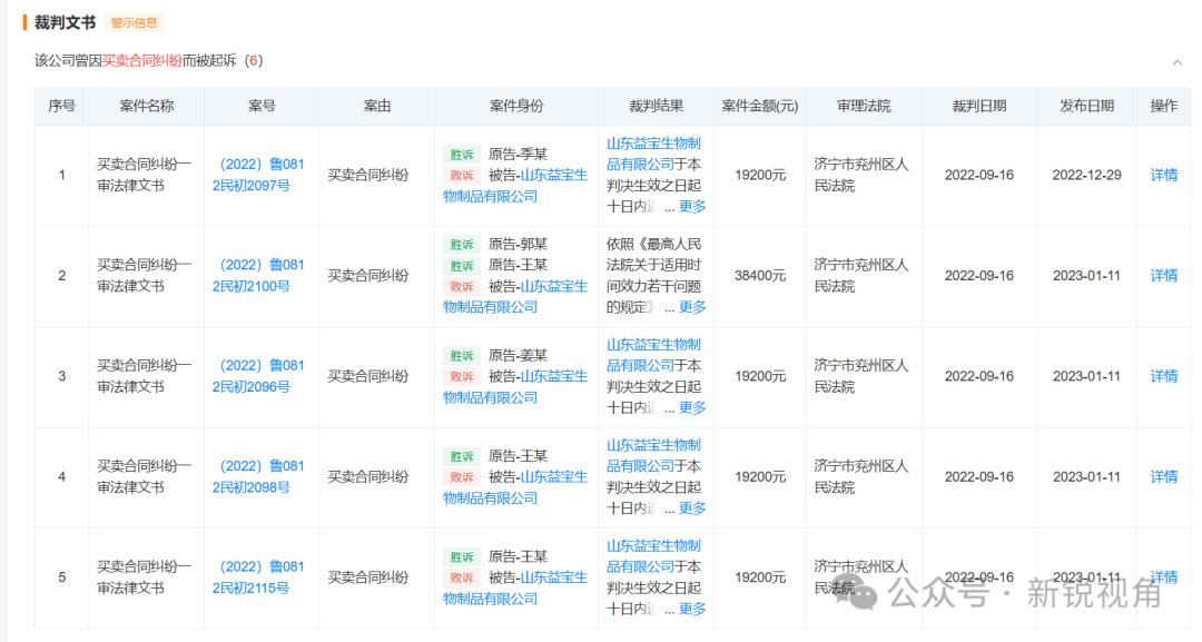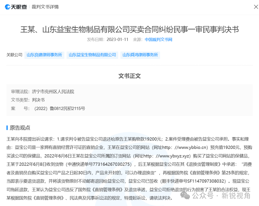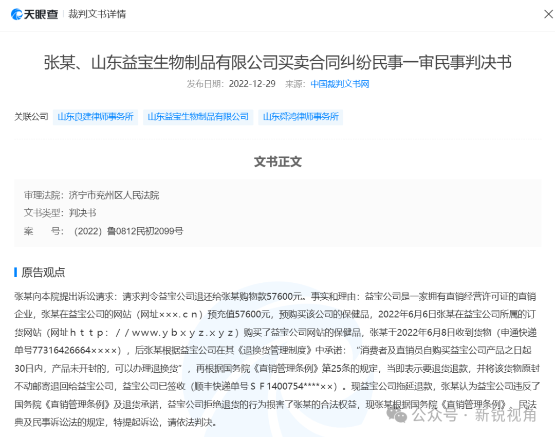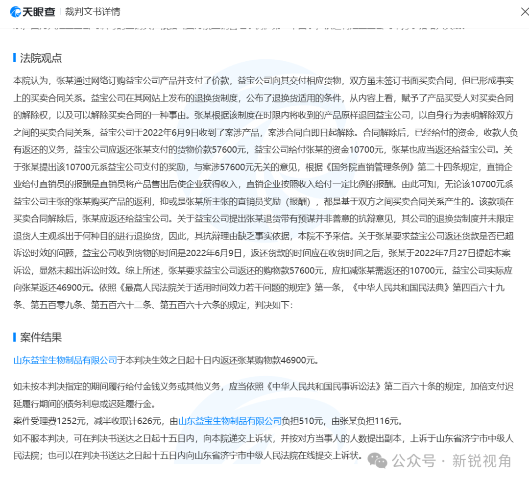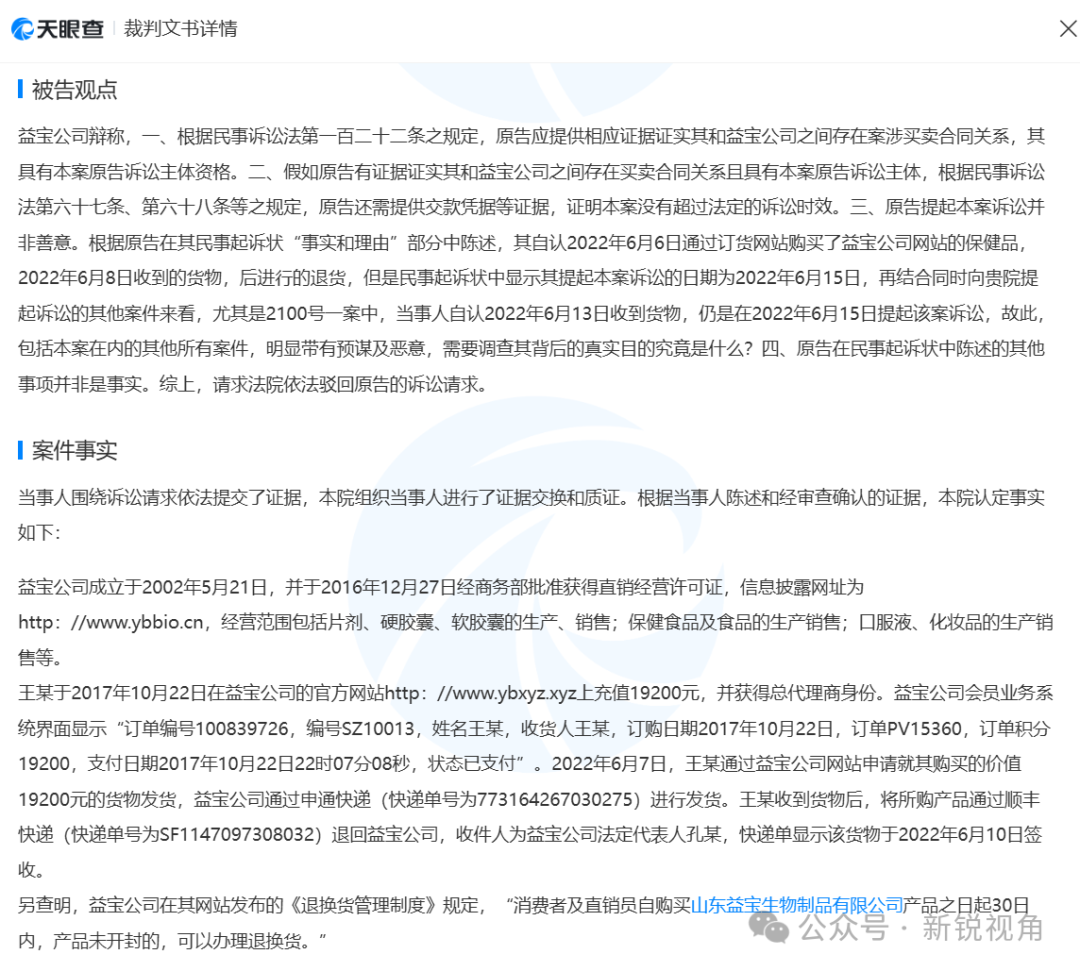 根据这张图我们可以看出有5个人和“山东益宝”存在买卖合同纠纷。(下图展示部分判决书)我们了解相关情况后得知,这5人都是在益宝官网上购买了产品,收到货后想退货,而益宝公司拒不退货。因为益宝公司在官网上承诺过产品30天未拆封、未使用可以申请退货退款。结果代理商真的要退货了,益宝就耍赖不退了。根据起诉时间来看,应该是先有一起胜诉判决后,剩下的几个人才分别起诉的。益宝公司在被告陈述中还说到,对方收到货后立即退货,前后时间太近,明显是有预谋的。也不知道益宝的律师是怎么想的,这种诡辩词都能当庭说地出来。你规定了可以无理由退货,那就是指消费者想退就退,你管我有什么预谋?