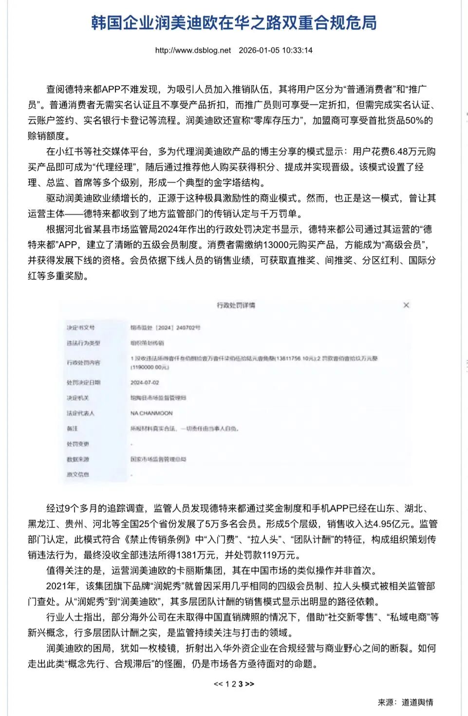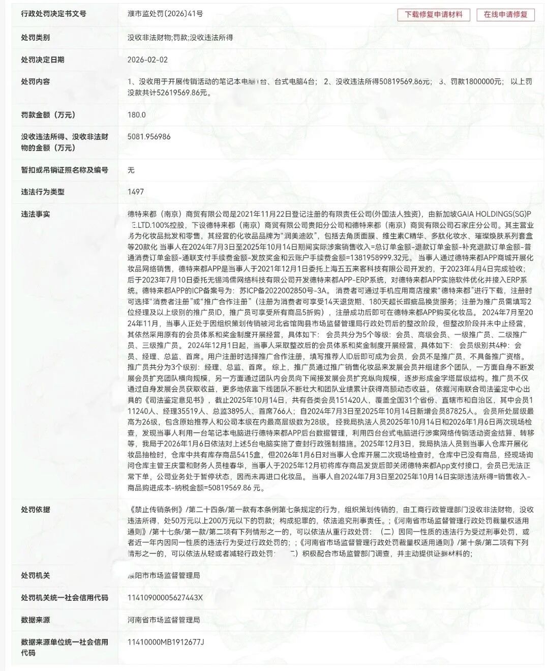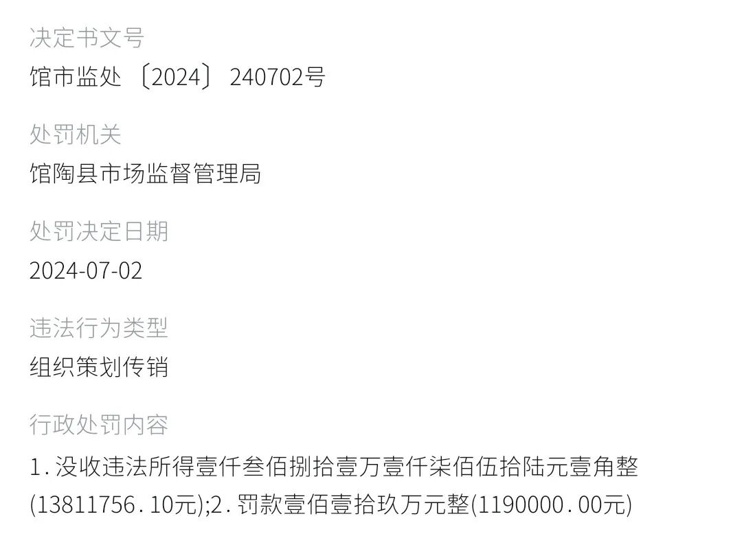 此前,德特来都还曾因涉及“组织策划传销”的违法行为而被河北馆陶县市监管理局没收违法所得1381万元,罚款119万元。
