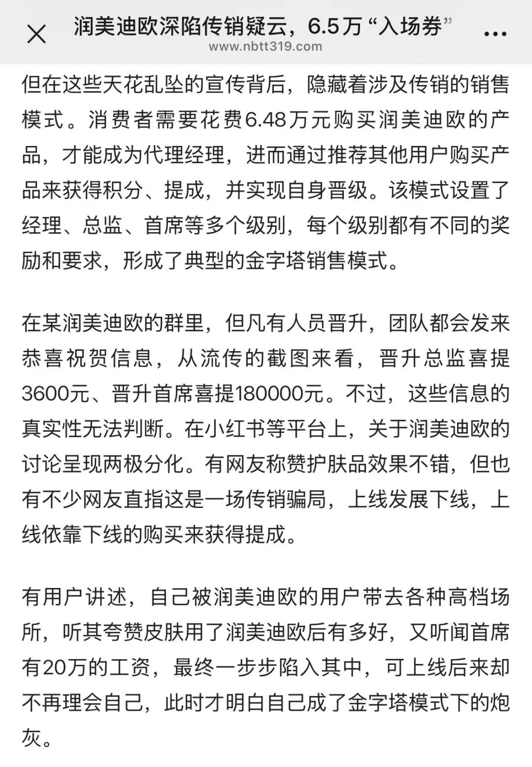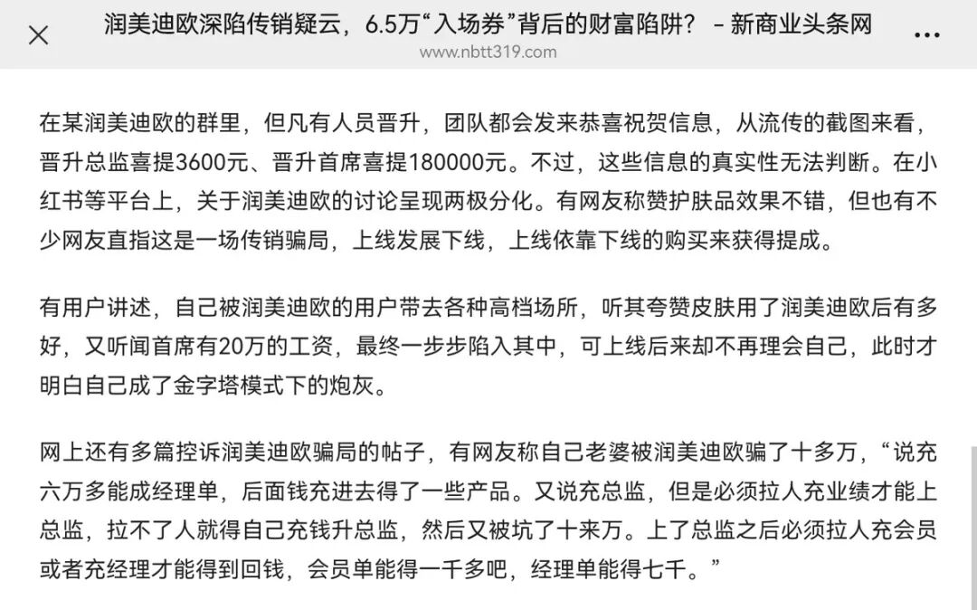 为何如此多的代理商会陷入囤货到降价再到亏损的怪圈? 新商业网头条曾在报道中提到,润美迪欧的销售模式设置了经理、总监、首席等多个级别,构建起典型的金字塔结构。消费者需要支付6.48万元购买产品才能成为代理经理,获得发展下线的资格。随后,通过不断推荐新用户购买产品,参与者可以获取积分、提成并实现级别晋升。