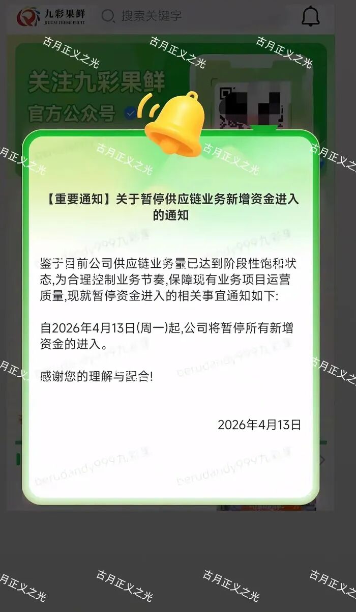 就在昨天——2026年4月13日, “九彩果鲜”突然发布了一份名为《关于暂停供应链业务新增资金进入的通知》 ,公告里白纸黑字写着:“自2026年4月13日(周一)起,公司将暂停所有新增资金的进入”。