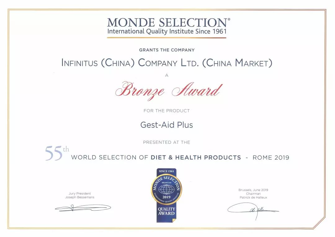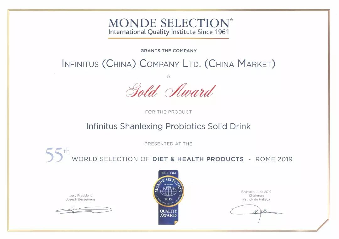 证书:无限极牌膳乐星益生菌固体饮料获得2019年金奖