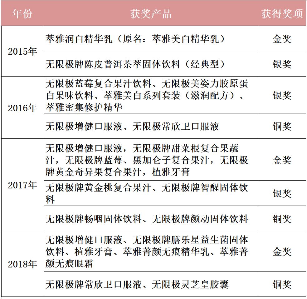 2015~2018年无限极产品获得世界品质品鉴大会奖项信息