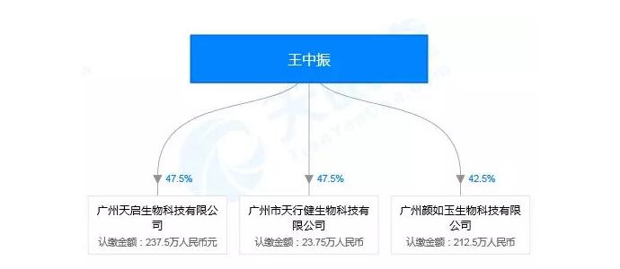 值得注意的是,除颜如玉外,王中振还担任广州市天行健生物科技有限公司及广州天启生物科技有限公司的股东,投资占比均为47.5%。
