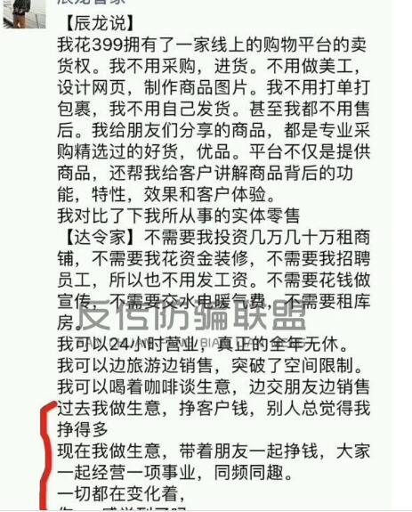 究竟是什么样的项目能月入40万?反传防骗联盟经过调查发现这家表面上以分享商品获得提成的“达令家”社交电商平台,实质上却是以发展新店主为名拉发展新人或团队,且奖励层层递进,缴纳399元购买指定商品成为店主,上家最高可获得230元的奖励。