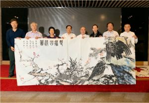 由“中国鹰王”美称的中国美协副主席王书平、“范增高徒”天津美协副主席尹沧海、吉佩定部长、唐国强大使、刘玉和大使联袂合作的丈二巨幅作品《双鹰四清图》将活动带入高潮,并作为本次活动的礼品赠送和治友德公司,祝愿和治友德公司四清品格弘扬中华文化,雄鹰展翅再创全球辉煌!