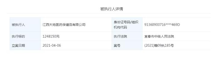 天眼查显示,2021年4月6日,江西大地医药保健品有限公司被宜春市中级人民法院执行1248150元,为首次执行。
