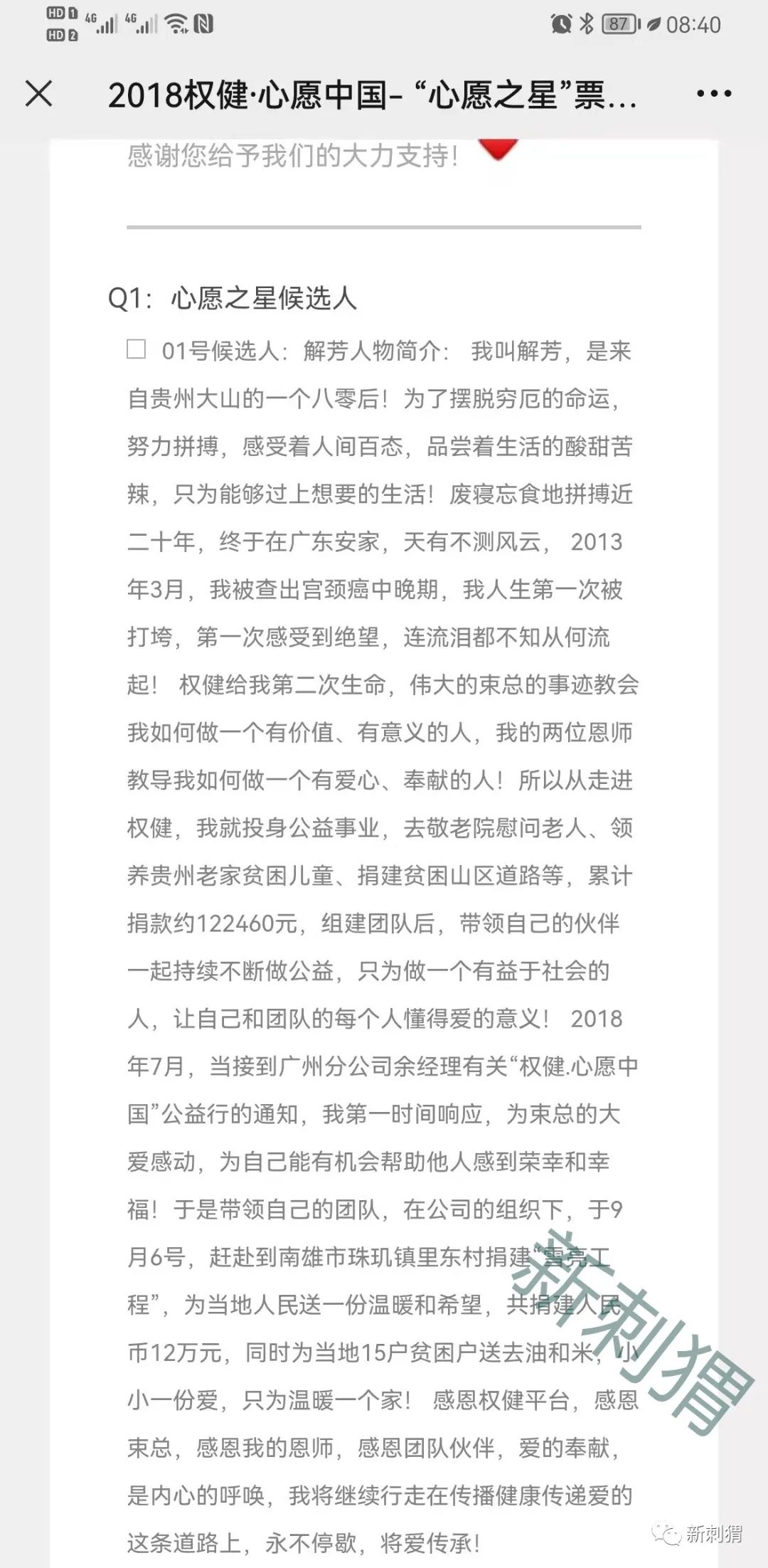 在那份个人介绍中,解芳是个充满传奇色彩的人。她是一位来自贵州的80后,经过20多年的拼搏后在广东安家,2013年3月被查出宫颈癌中晚期。她声称是“权健给我第二次生命,伟大的束总(束昱辉)的事迹教会我如何做一个有价值、有意义的人”等,这句话的意思似乎是权健集团治好了她的癌症,当然目前没有资料可以证明是否真是如此。